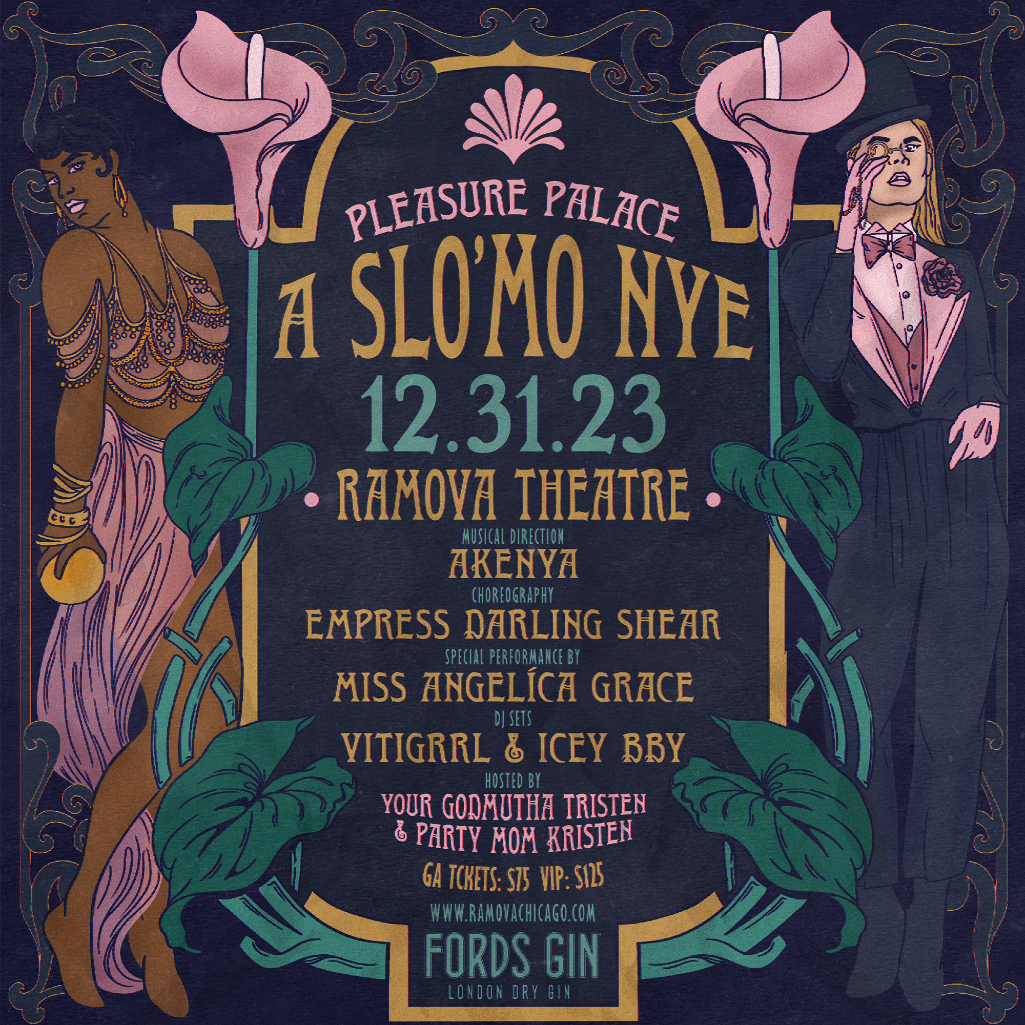 Born in the late 1920s as a movie theater, the iconic Ramova makes a triumphant return reimagined as a 1500-capacity music venue, making it one of the largest of its kind on Chicago’s south side. Slo ‘Mo’s Pleasure Palace NYE is slated to be the first major event for the venue, and we are proud to usher in the new era with our femme-forward, queer-centered, joy-generating approach to performance and parties. The grand evening will feature a live jazz band like those found in the era’s clubs and speakeasies musically directed by Akenya, with scintillating dance performances choreographed by Empress Darling Shear and DJ sets by Slo ‘Mo’s VITIGRRL & Icey Bby. The grand affair is hosted by our party matriarchs, Your Godmutha & Party Mom.