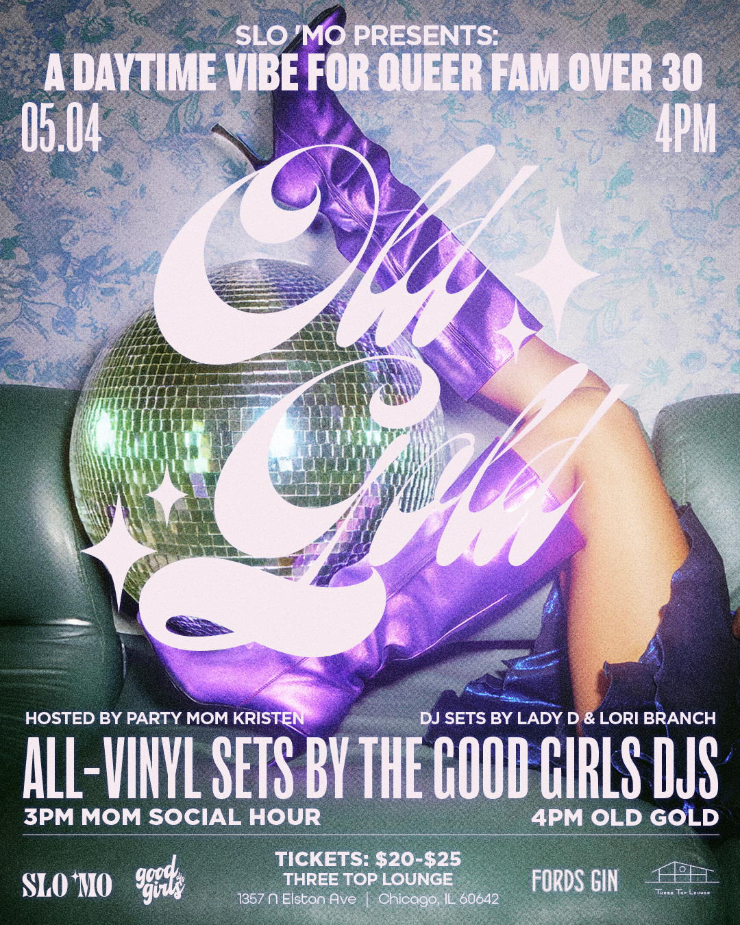 Spring is in the air at our next Old Gold day soiree at Three Top Lounge May 4. Featuring the intergenerational DJ trio the Good Girls, Old Gold is our beloved daytime affair for queer fam over 30. This May edition we celebrate the mothers in our community, hosted by Chicago’s Party Mom Kristen Kaza with R&B, disco, and house all-vinyl sets by legendary DJ moms Lady D and Lori Branch. The afternoon will begin with a Mom Social Hour featuring a sound bath ritual led by bodyworker/healer and Slo ‘Mo’s Godmutha Tristen of TuneInWithTristen followed by cocktails and n/a spritzers hosted by Fords Gin. Old Gold will officially kick off at 4PM until the sunsets over the beautiful Chicago skyline.